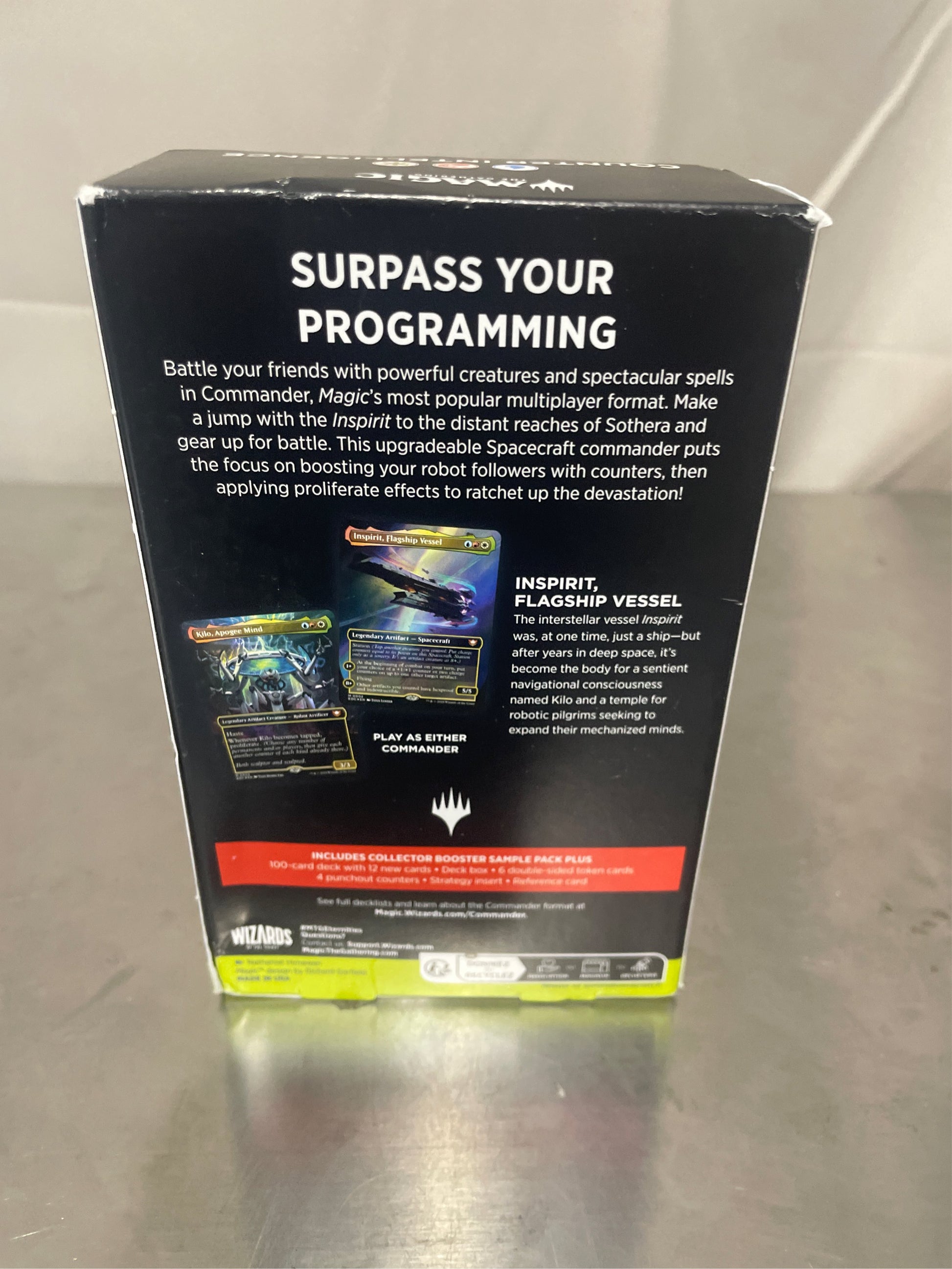SURPASS YOUR PROGRAMMING Boost artifacts and proliferate counters with the aid of interstellar vessel, Inspirit, and its sentient navigational consciousness, Kilo 2 FOIL BORDERLESS COMMANDERS Every Edge of Eternities Commander Deck includes 2 Traditional Foil Legendary Creature cards featuring Borderless art INTRODUCES 12 COMMANDER CARDS Each deck introduces 12 never-before-seen Commander cards to Magic: The Gathering COLLECT SPECIAL TREATMENT CARDS Each deck also comes with a 2-card Collector Booster Sample Pack containing 1 Traditional Foil card and 1 alt-border Rare or Mythic Rare (foil or nonfoil) THRILLING MULTIPLAYER BATTLES Commander is a multiplayer way to play Magic, an epic, free-for-all battle full of strategic plays and social intrigue CONTENTS 1 ready-to-play Counter Intelligence Edge of Eternities MTG Commander Deck (100 cards), a 2-card Collector Booster Sample Pack, 10 double-sided token cards, and 1 deck box.