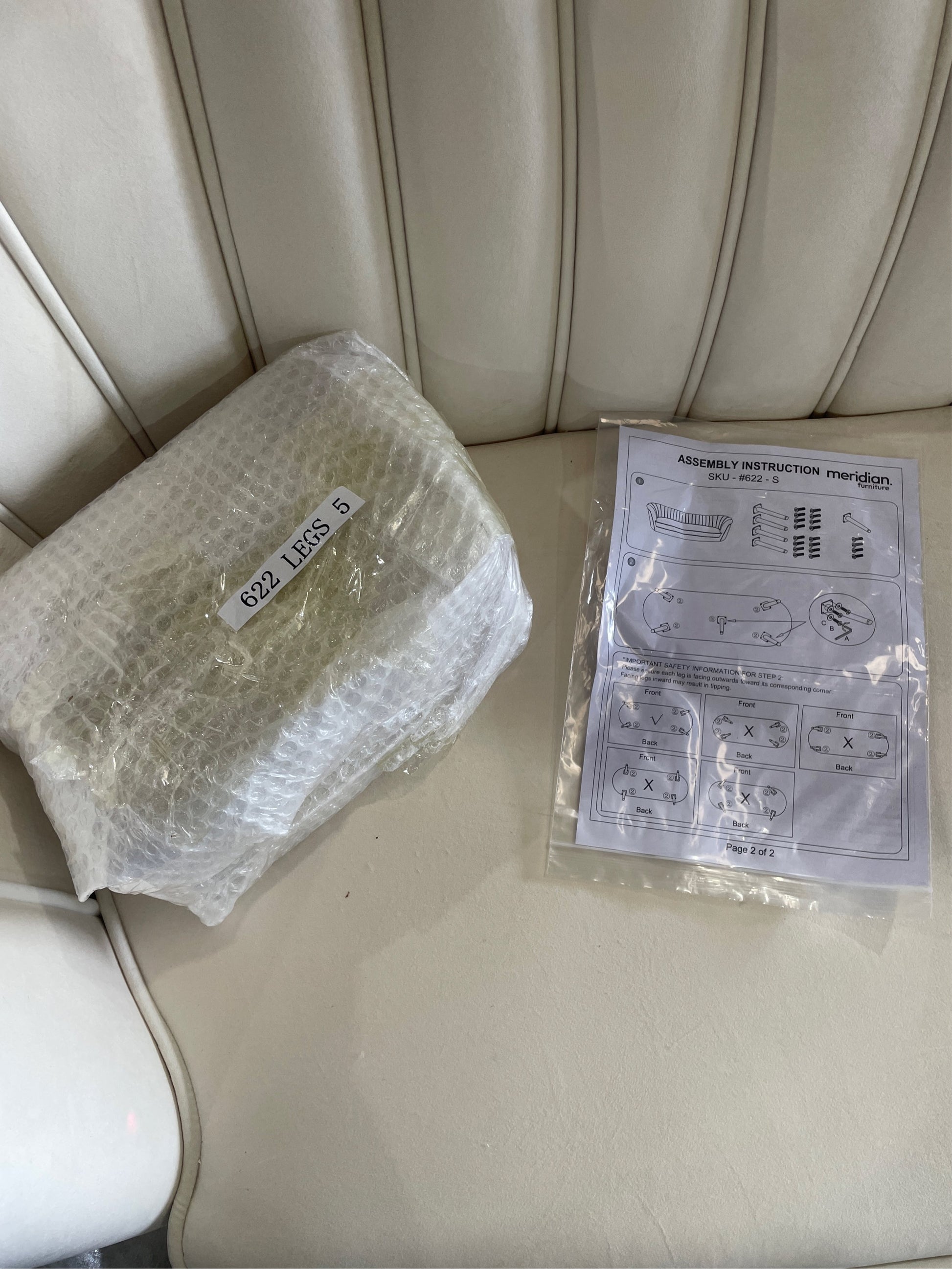 Retail Price: $1,099 Notes: Item is an excellent condition. Category: Furniture Department: Furniture Condition: New Damaged?: No Damage Description: As pictured In Packaging?: No Assembly Required?: Yes Star Rating: 5.0 Missing Parts?: No Functional?: Yes Brand: Meridian Model: 622Cream-S ASIN: B0758RZQPK Title: Margo 88 Velvet Upholstered Sofa.