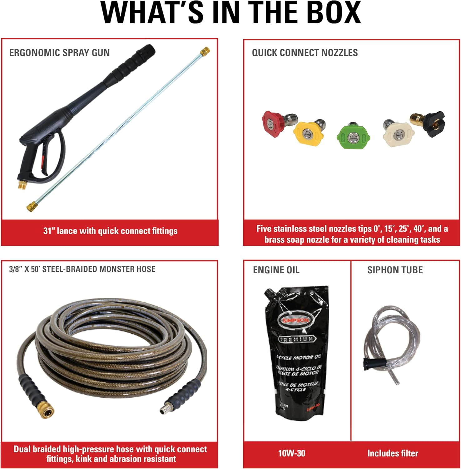 Professional Performance: Easy-to-assemble and easy-to-start with its HONDA GX390 engine commercial series engine, the Aluminum Series power washer is great for contractors who specialize in deck cleaning, wood restoration, and all professional services Power and Durability: A powerful, reliable, maintenance-free CAT Industrial triplex plunger pump delivers 4200 PSI at 4.0 GPM and includes thermal relief to prevent overheating Sturdy and Portable: The aircraft grade aluminum platform with brushed extruded aluminum tubing offers durability and corrosion resistance; 13-inch premium pneumatic tires deliver ease of maneuverability across various terrain and uneven ground Includes Quality Simpson Accessories: Monster 3/8-inch x 50-foot high-pressure hose is kink- and abrasion-resistant; 5 Quick connect nozzle tips: 0 , 15 , 25 , 40 and Soap; 16-inch steel wand/lance; Professional spray gun with safety lock-out Important Notes: 49-State Compliant; Pump/Hose Connection: Threaded M22 connection.