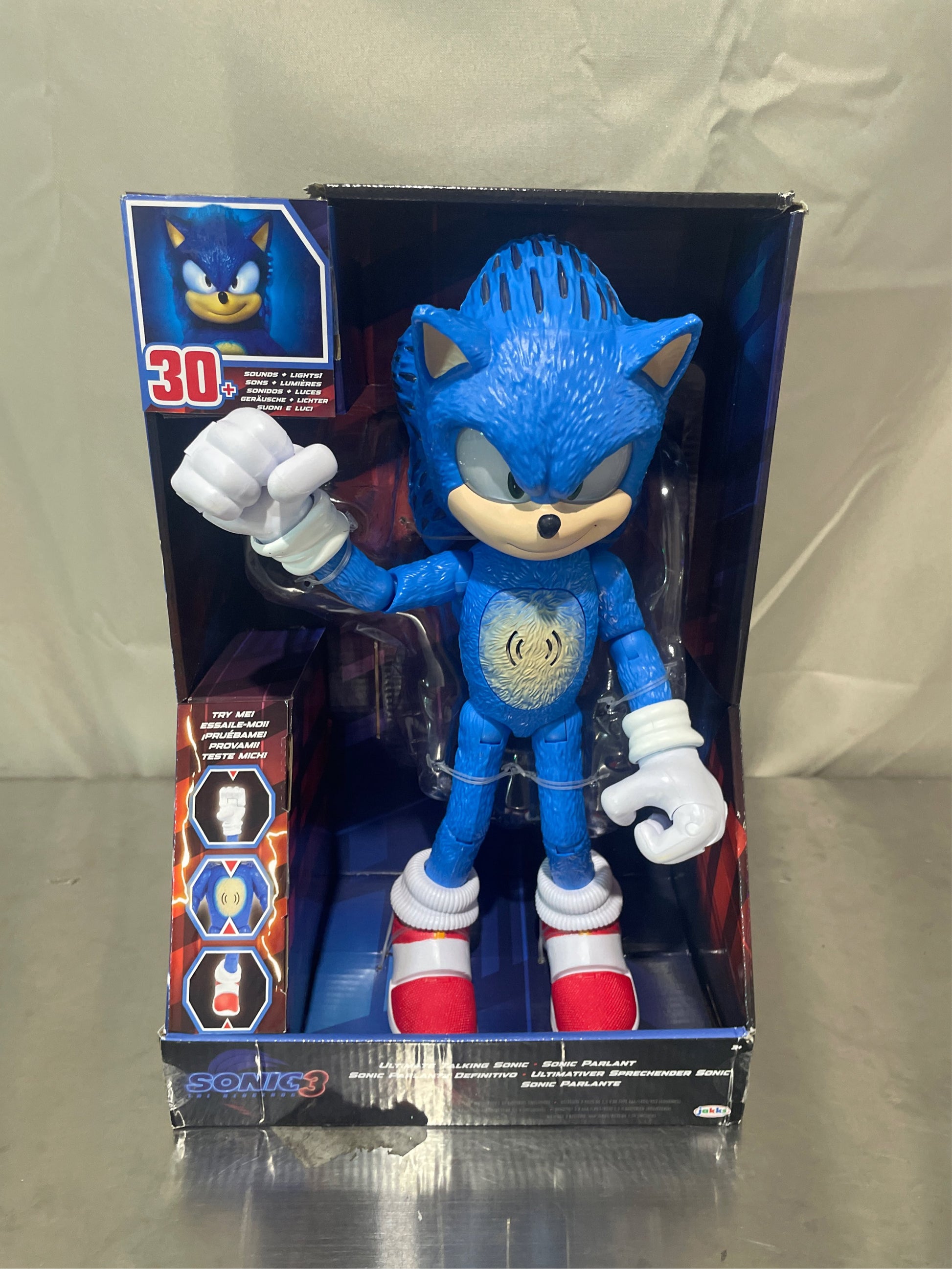 12 scale movie-styled figure inspired by the Sonic the Hedgehog movies Features 30+ iconic and humorous phrases and sounds from the movies Light-up eyes and quills by pressing Sonic s chest Press Sonic s hands and sneakers to activate phrases and sounds!.