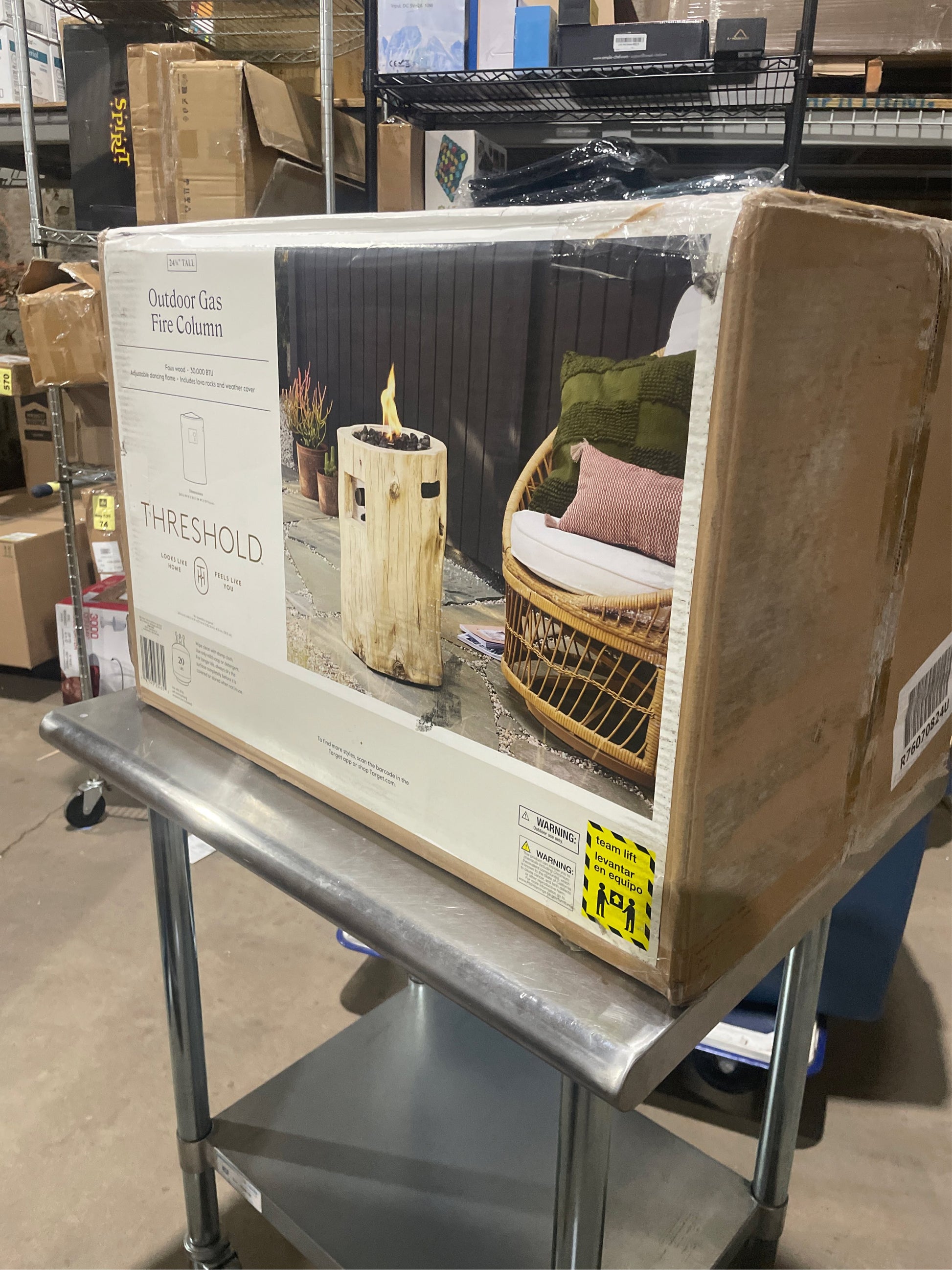 Enjoy the winter outdoors alone or host friends and family in the backyard with this Weathered Large LP Round Fire Column from Threshold . The heat- and weather-resistant design of this propane fire pit helps keep it looking great throughout the seasons. The round fire column is complemented by lava rock filler and a control knob that helps to adjust to the right temperature, creating the perfect ambiance to snuggle up with a loved one or a good book. Plus, the side cut-out handles allow for easy portability from place to place.